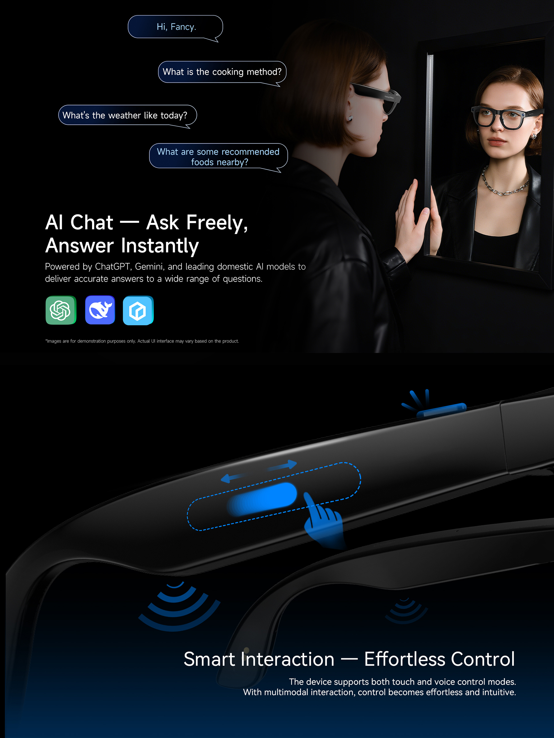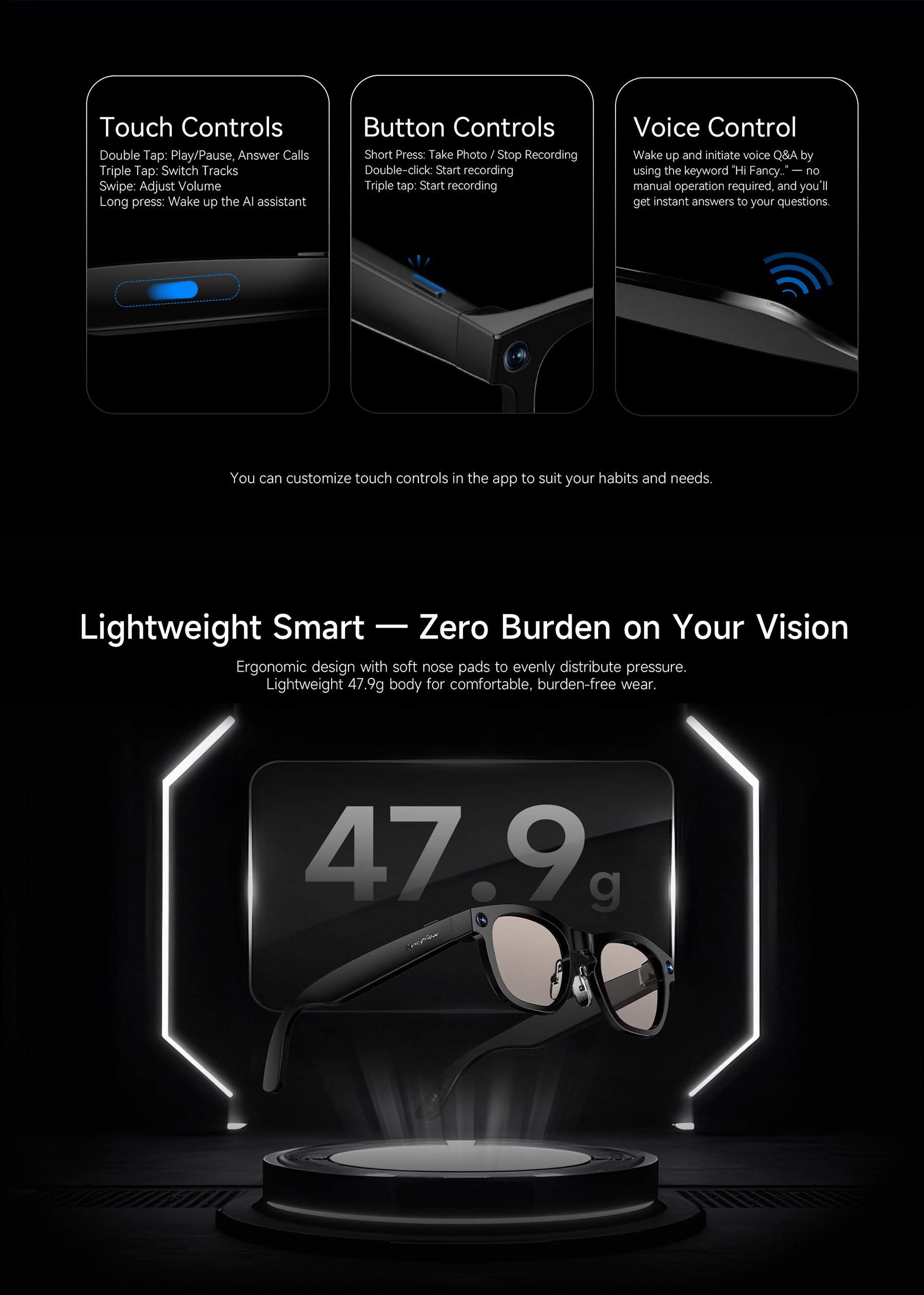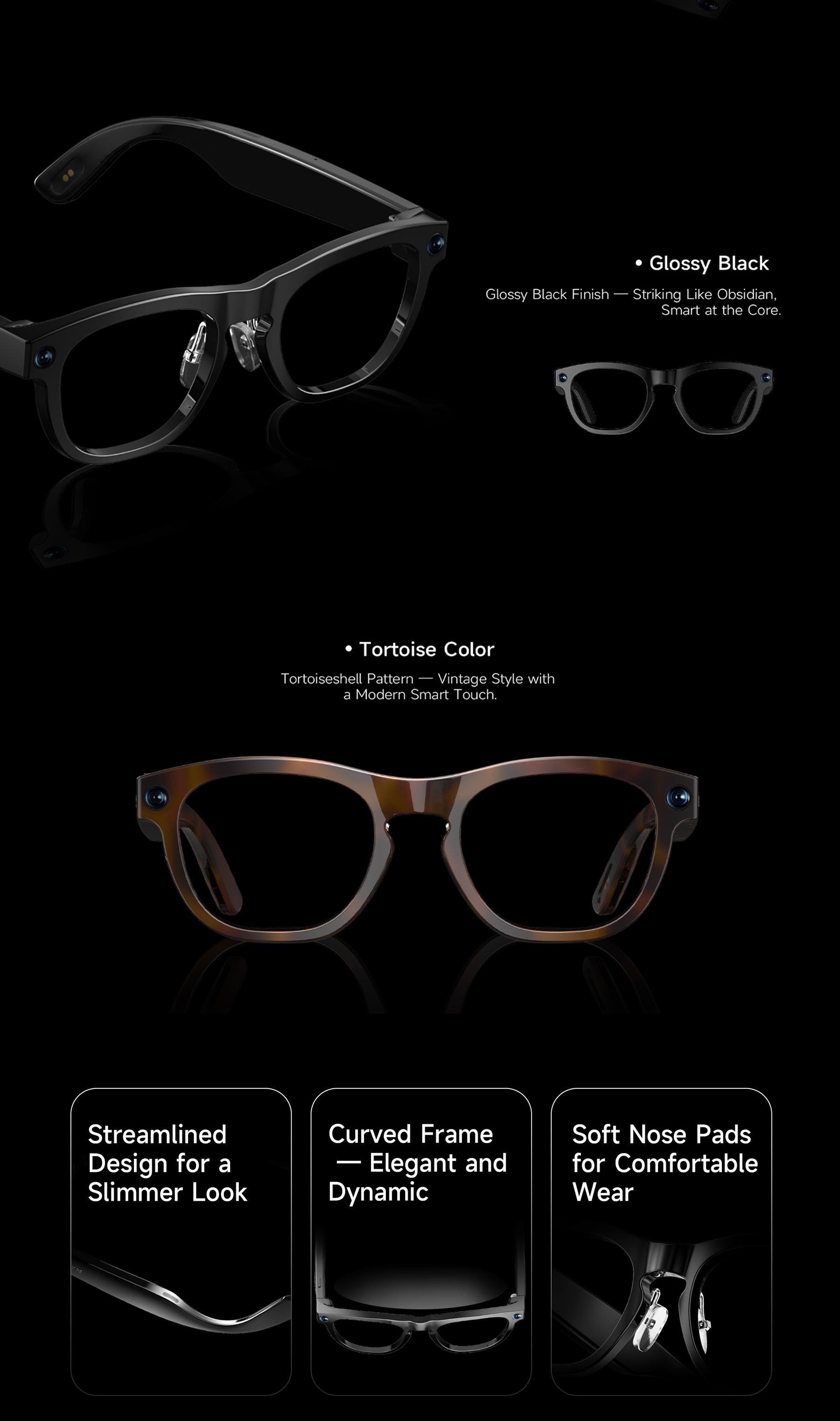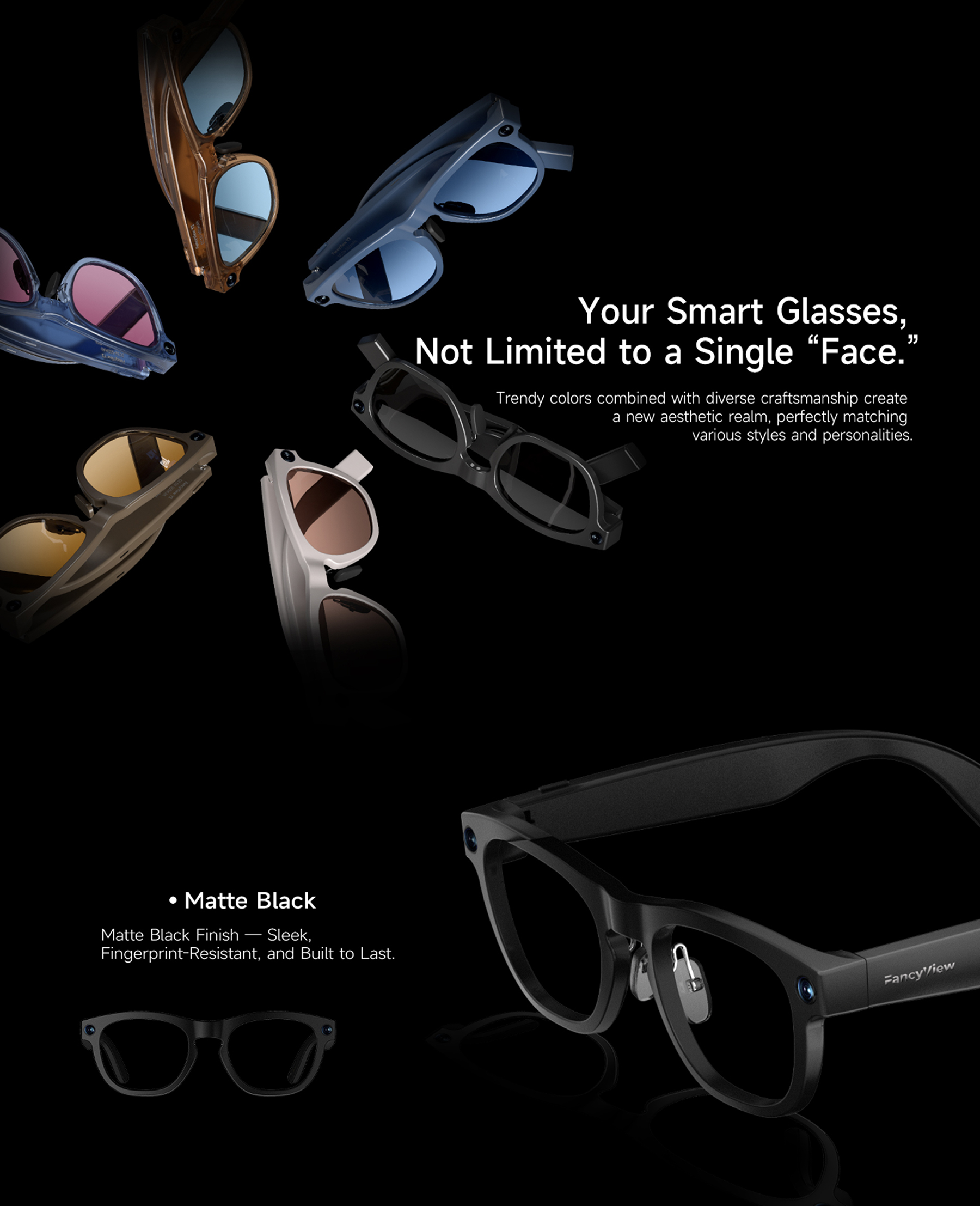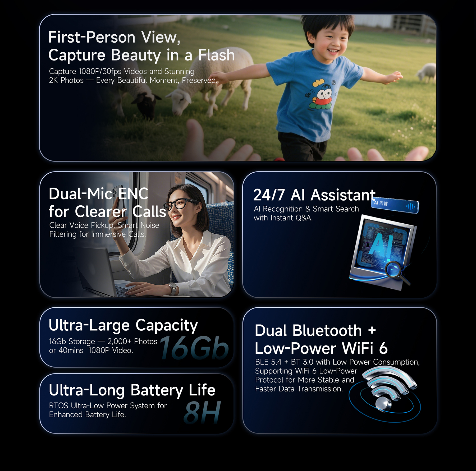 AI眼镜 Glasses YIFirst-Person View. Capture 1080P/30fps Videos and Stunning 2K PhotosDual-Mic ENC for Clearer Calls24/7 Al AssistantUltra-Large CapacityUltra-Long Battery Life Color 选择Color Matte Black 选择Color Tortoiseshell 选择Color Green Striped 选择Color Glossy Black 选择Color Blue Stripe Tortoiseshell 选择Color Blue Speckled 选择Color Transparent Gradient立即咨询Click Here联系我们,携手共建智能未来*感兴趣的产品智能手表智能眼镜智能戒指智能耳机You may also like AI眼镜 Glasses SI